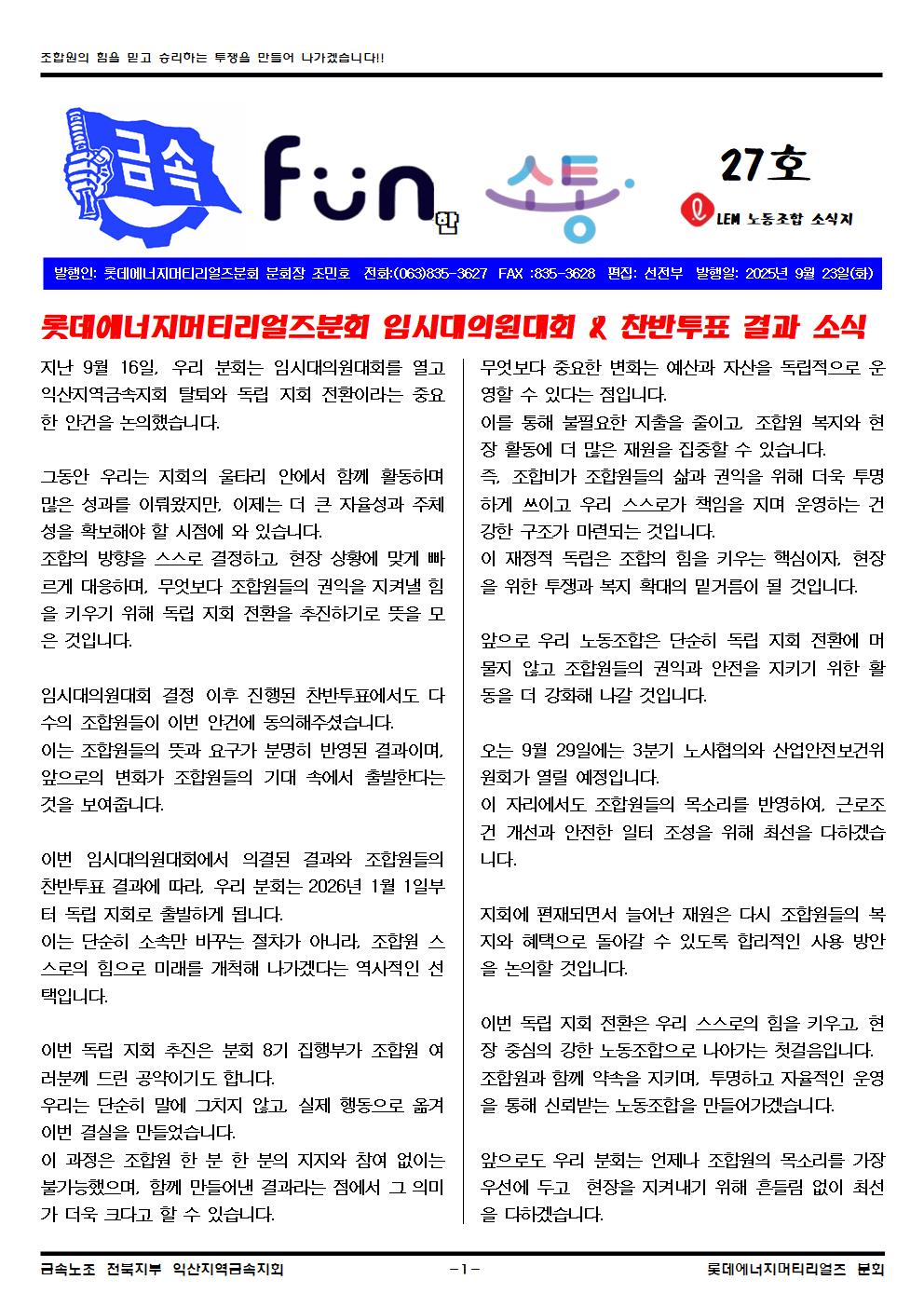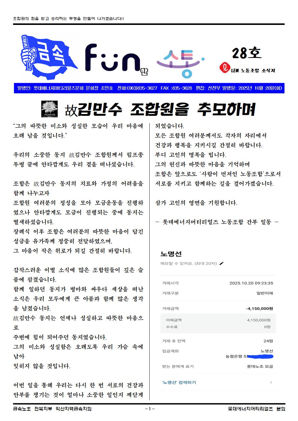 [조합원 성금 모금 안내]우리의 소중한 동지 김만수 조합원이 현재 림프종 투병으로 위독한 상황입니다. 조합 차원에서 치료와 가정의 어려움을 함께 나누고자 모금운동을 진행합니다. 모금 방법- 카카오뱅크 모임통장 계좌: 3333-35-1144571 (조영재) - 기간: 9월 24일(수) ~ 10월 1일(수) - 현장 참여: 자율모금 모인 정성은 조합에서 10월 2일 김만수 동지 가족께 전달하며, 모든 내역은 확대간부회의에서 투명하게 보고드리겠습니다. (카카오톡 모임통장 수석부분회장,사무장,대대표, 초대후 이체내역 관리 및 확인)동지는 결코 혼자가 아닙니다. 여러분의 따뜻한 마음이 큰 힘이 될 것입니다.2025.07